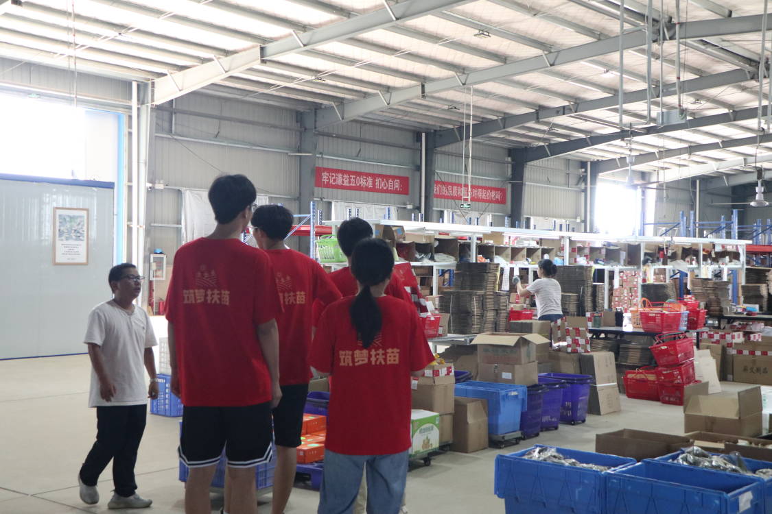 下午,實踐隊到達公司的產品加工銷售工廠。首先,豐收哥帶實踐隊員們了解了主要構成。實踐隊員參觀了產品儲存倉庫,在了解各產品現有庫存量后,實踐隊員們通過品嘗、分享和討論,切身感受到謙益公司產品健康、無添加的優勢。