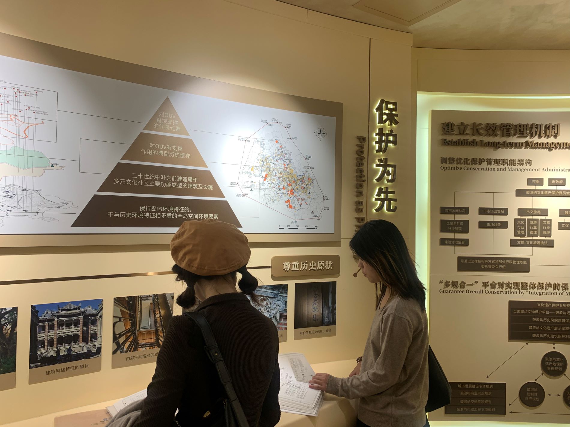 在鼓浪嶼歷史文化陳列館中,實踐隊員通過館內大量模型、照片、銅像等,對鼓浪嶼的三個主要歷史時期發展歷程、建筑園林等多方面的成就以及其申遺保護過程和經驗做法有了更加清晰的認知。鼓浪嶼文化遺產的保護始終堅持“保護為先、文化為魄、以人為本”,建立了可持續發展的長效管理機制等方式精心守護老祖宗留下的文化遺產,保護傳承歷史文脈。
