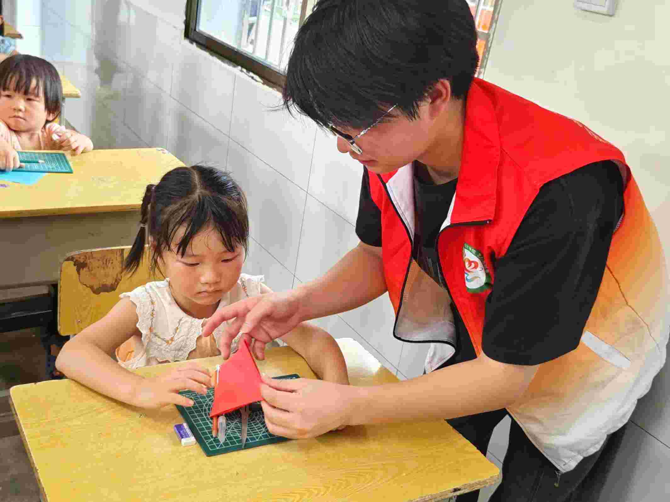 (圖為志愿者教小朋友剪紙 張安棋 攝)