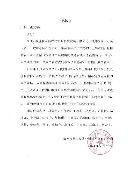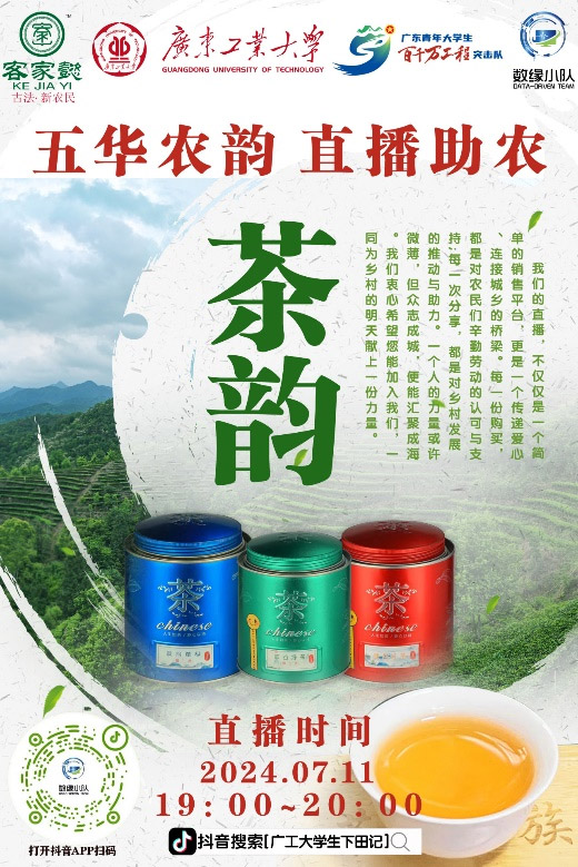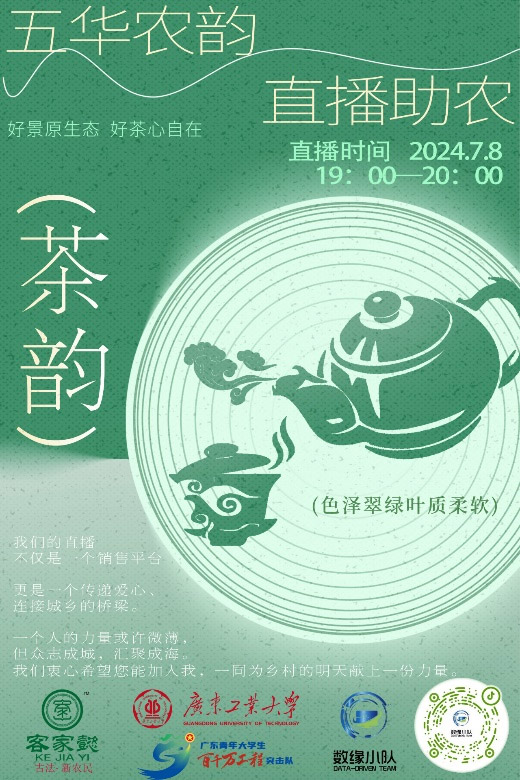 廣東工業大學“數緣”團隊積極響應時代號召,在梅州市五華縣以“百縣千鎮萬村高質量發展”為指引,以電商直播為翼,為鄉村農產品插上銷售的翅膀,助力當地特色茶產業破繭成蝶,煥發新的生機與活力。