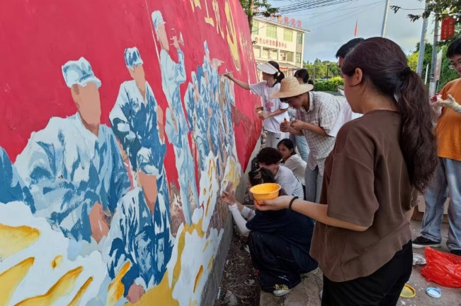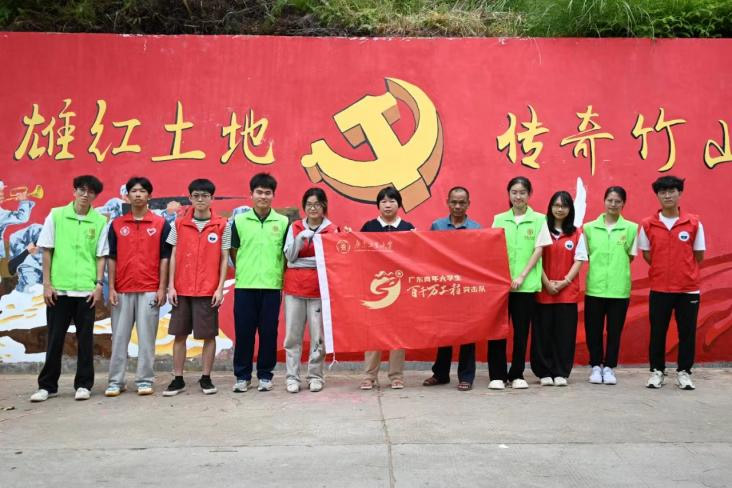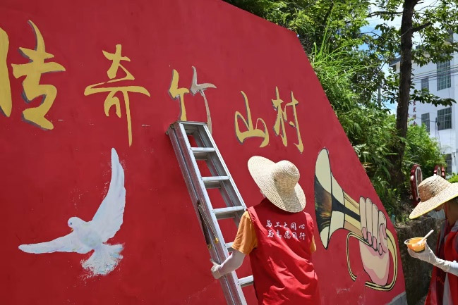 紅色主題墻繪直播 隊員們在竹山村委的協助下,以竹山狙擊戰為主題,將原有的已被青苔、灰塵層層覆蓋的墻繪重新翻新。通過直播形式,讓更多的人了解竹山村的紅色歷史和文化,傳承和弘揚革命先烈的英勇事跡和崇高精神。