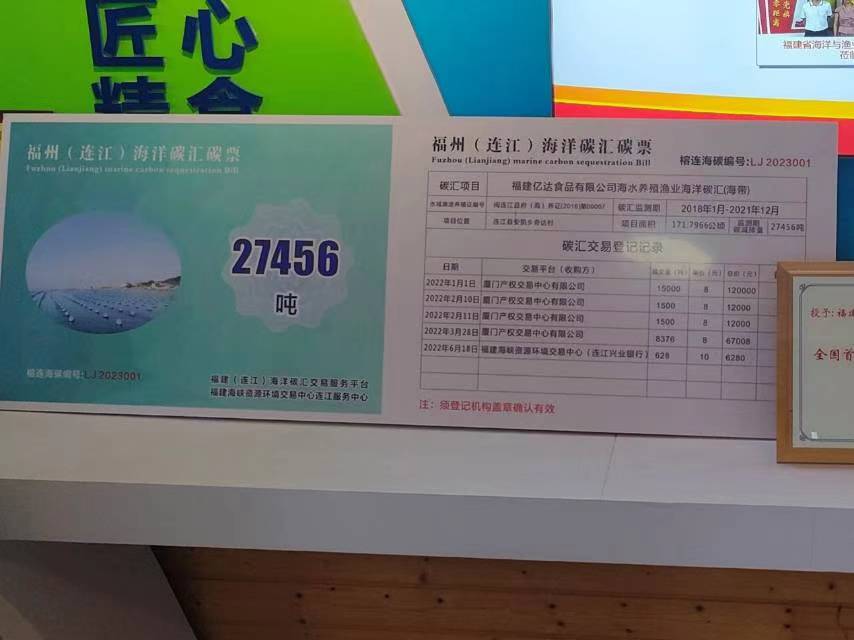 福建億達食品有限公司作為福州本土的海帶產業化龍頭企業,率先于福州(連江)碳匯交易服務平臺完成了第一筆海洋碳匯確權登記。2023年6月3日,在福州舉行的海洋(漁業)碳匯高峰論壇上,連江縣向福建億達食品有限公司頒發了全國首張由海洋與漁業部門備案確認的藍色碳票。藍色碳票是依據中華人民共和國海洋行業標準《海洋碳匯經濟價值核算辦法》,經第三方機構監測評估、認證,海洋與漁業局備案,海洋碳匯交易部門登記的海洋碳匯量而制發的具有收益權的憑證。
