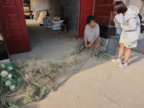 黃河之水天上來,奔流到海不復回,在東營這片廣袤的土地上,漁業一直是當地經濟的重要支柱,漁民們世代以海為生,勤勞勇敢,形成了獨特的漁文化。走在漁村的小巷里,海風輕拂,魚腥味與咸濕的空氣交織在一起,仿佛能嗅到歷史的味道,感受到漁民生活的艱辛與堅韌。我們的實踐活動涉及多個方面,包括切身進入漁村體驗漁網修補,參觀特色民宿等。
