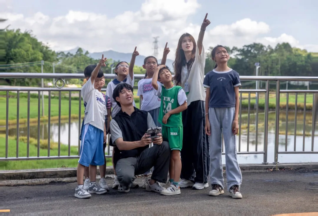 圖為筑夢實踐隊隊員在為孩子們進行無人機展示教學