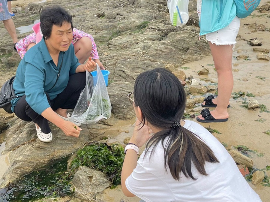 圖為實踐隊員與趕海游客交談。中國青年網通訊員 張曉琳 供圖