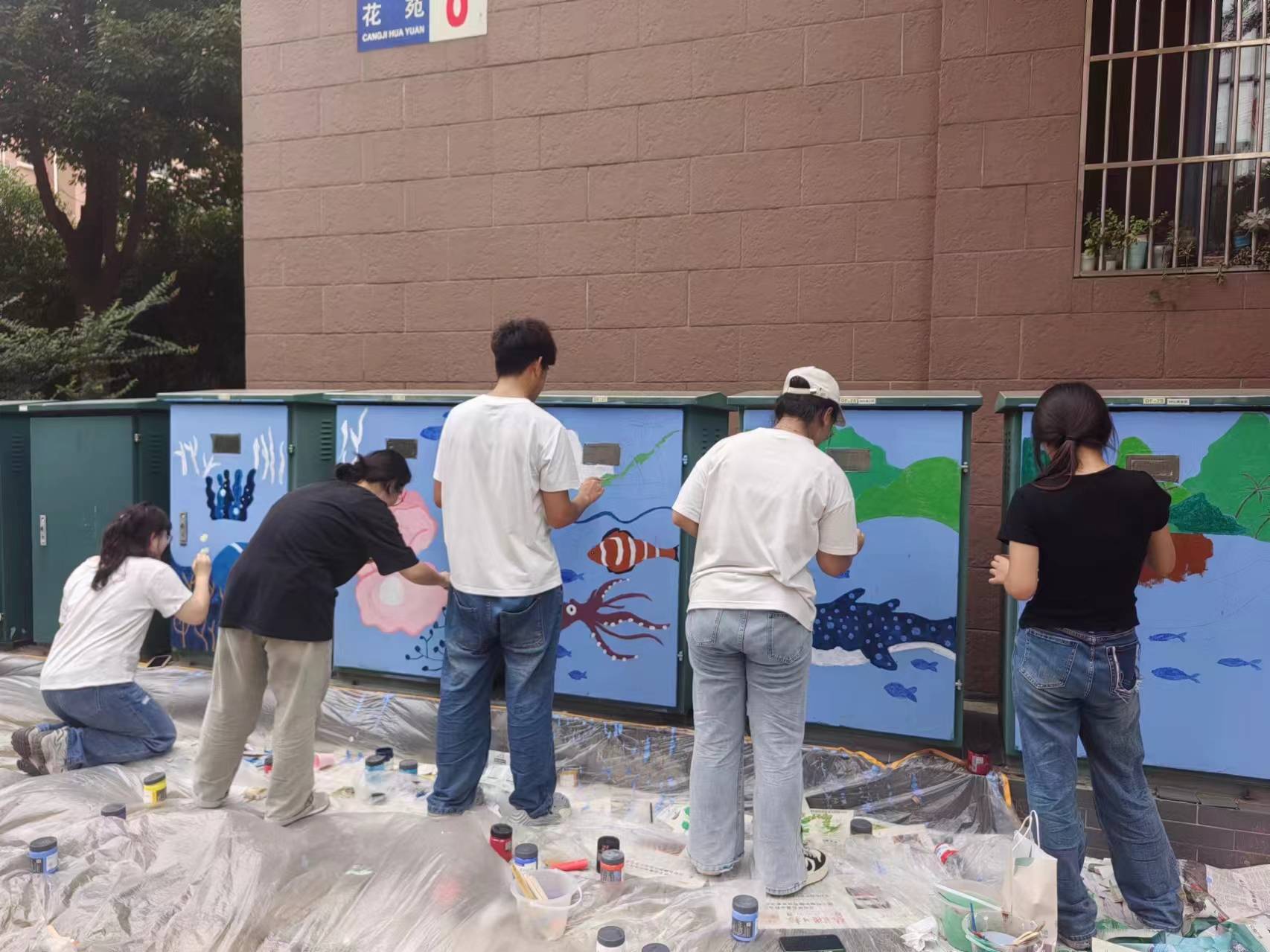 繪制階段:我們分組進行繪畫,有的負責起形描邊,有的負責調色上色,有的負責拍照,大家各司其職。我們克服了天氣等不利因素,用畫筆和顏料將一幅幅精美的圖案呈現在墻上。社區居民也積極參與其中,有的提供繪畫建議,有的幫忙準備顏料,現場氣氛十分融洽。
