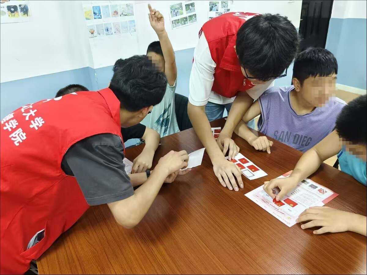二、旗幟背后的故事:貼畫中的愛國(guó)情懷然而,當(dāng)活動(dòng)進(jìn)行到國(guó)旗、黨旗、團(tuán)旗的講解時(shí),孩子們的熱情有所減退,開始變得躁動(dòng)不安。面對(duì)這一挑戰(zhàn),隊(duì)員徐錦升和馮子琦采用了更加直觀生動(dòng)的教學(xué)方式——貼貼畫認(rèn)旗幟。孩子們興奮地挑選著自己喜歡的貼紙,一邊貼一邊聽我們講述每面旗幟背后的故事。雖然他們的理解可能還不夠深入,但那份對(duì)知識(shí)的渴望和對(duì)國(guó)家的熱愛,卻通過他們專注的眼神和認(rèn)真的態(tài)度,無(wú)聲地傳遞給了在場(chǎng)的每一個(gè)人。