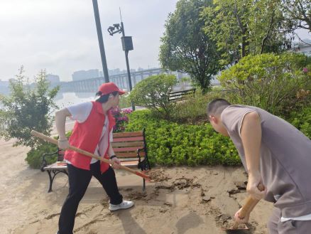 在清潔過程中,實踐團隊發現公園的清潔工人在鏟除暴雨裹挾在地面上的淤泥,實踐隊員們都自告奮勇幫助工人們鏟除淤泥,不但減少了工人們的勞動負擔,也進一步維護了社區的整潔面貌。