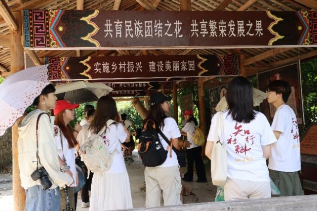 宣傳貫徹民族精神,多途徑合力滋潤群眾心田。通過走訪參觀,支教團深入學習坡芽村建設全國文明村、全國民族團結進步創建示范村的奮斗經驗,實地感悟當地民族團結進步工作取得的巨大成就。坡芽村立足本村實際情況,采取道路標語、建筑墻貼、展板展廳等多種宣傳手段,將民族政策落實到群眾生活之中。村中各處設置有民族團結宣傳標語,“像珍視自己的生命一樣珍視民族團結”在潛移默化中影響各族群眾,進而內化于心,外化于行,成為推動社會發展的強大力量。此外,坡芽村張貼“美麗家園示范戶”門牌,提倡鄰里和諧共處,尊重不同民族的文化。