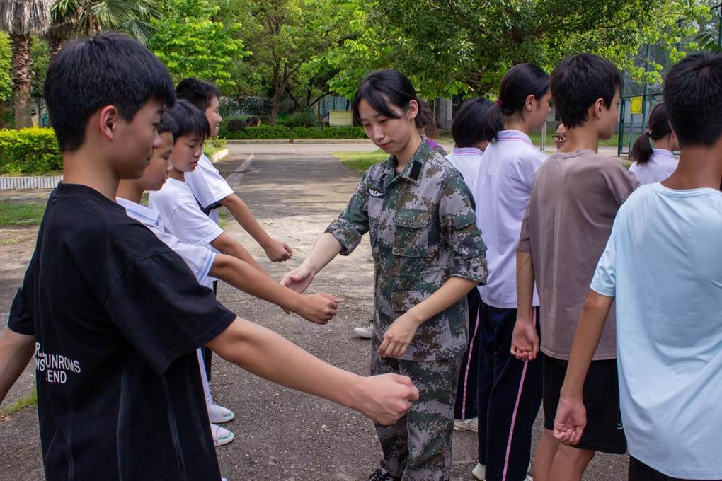在本次活動中擔任教練員的實踐隊隊員童淅瑤是一名大學生退伍軍人。童淅瑤同學為當地少數民族學生們展示中國軍人的風采,分享自己兩年軍旅生涯的故事與參軍入伍的感悟,并對軍事訓練體驗的內容進行簡要介紹。同學們聽得入神,眼中充滿著期待。介紹結束后,童淅瑤組織訓練有序開始。站軍姿、齊步走、正步走、跨立……各項動作訓練有條不紊,循序漸進。童淅瑤一遍遍向學員們示范標準動作,講解動作要領。參訓的畬族小伙伴們也一點兒都不馬虎,嚴肅認真,令行禁止;在教練員的耐心指導下姿勢動作越來越標準,整齊劃一,利落有力,出色地完成所有動作訓練,稚嫩的臉龐上眼神堅毅,顯露出頂天立地的精氣神來。