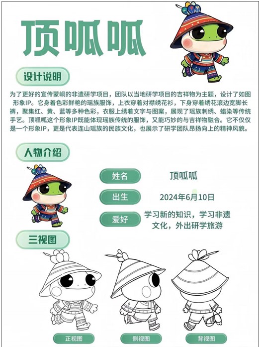 多樣化的文創產品有助于推動文化產業的發展和創新,也為文化傳承和創新提供了新思路、新途徑。實踐團經過多天走訪學習,融合當地狀瑤特色和非遺元素設計了“頂呱呱”IP,同時,結合當地村民和游客需求推出并落地了例如帽子、貼紙、微信表情包、防蚊貼、水瓶背帶繩等系列文創產品,以更貼近生活的方式來推廣壯瑤民族文化,讓人們在日常生活中感受到非遺文化的韻味。