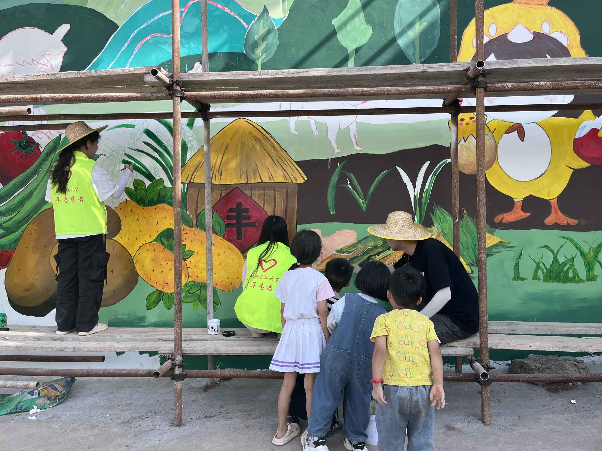 線下墻繪組成員們為了在有限的實踐中,幫助西沖社區繪制更多文化墻,他們頭頂炎炎烈日、揮灑汗水,緊鑼密鼓開展墻繪工作,扎扎實實地完成了測量、刷底、起稿、定線、上色等工作,實實在在地把磚墻變成富有詩意的精美畫卷,這不僅是青春對鄉村的深情贊歌,也是青年對時代熾熱的回答。