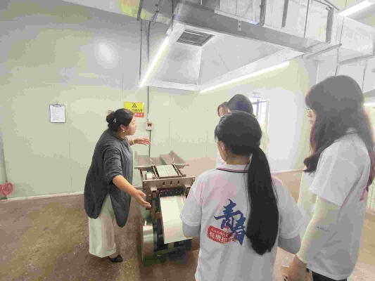 圖為安徽博潤(rùn)藥業(yè)有限公司總經(jīng)理黃鳳美為團(tuán)隊(duì)成員介紹飲片加工儀器的運(yùn)行原理以及使用方法。