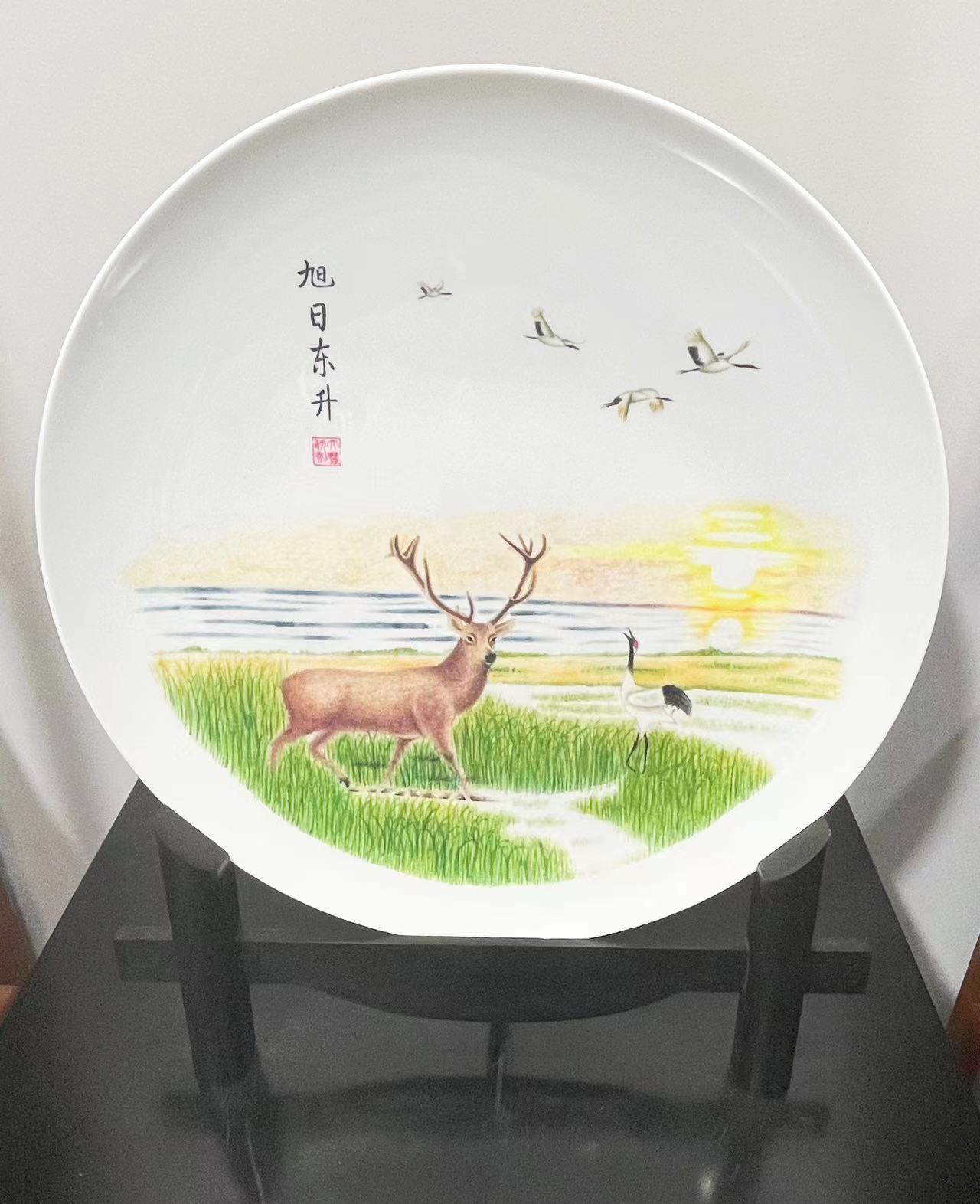 實(shí)踐團(tuán)成員們參觀了展示廳內(nèi)陳銀付的每幅作品。這些作品有傳統(tǒng)的花鳥魚蟲、山水風(fēng)景,還有人物肖像,但更多的是以鹽城特色景物或動(dòng)物為描繪對(duì)象,如麋鹿,丹頂鶴等。無(wú)論是細(xì)致入微的雕刻,還是生動(dòng)傳神的畫面,每一件作品都讓人贊嘆不已。實(shí)踐團(tuán)成員們?cè)谡蛊非榜v足觀賞,仔細(xì)品味其中的藝術(shù)之美,不時(shí)與講解員交流,了解更多背后的故事和技藝。展示廳還特別展示了瓷刻藝術(shù)所用的金剛鉆與瓷盤。實(shí)踐團(tuán)成員們紛紛感嘆能在如此脆弱的物件上雕刻,瓷刻藝術(shù)真是剛?cè)岵?jì),精細(xì)十足。