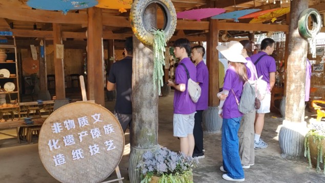 在調(diào)研過程中,實踐團來到曼空岱的傣族非遺文化體驗館,體驗了以傣陶、傣紙、傣裝為代表的傣族非遺文化。在與農(nóng)戶的交談中,成員們了解到村民在對傣族非遺技藝保留傳承的基礎(chǔ)上,實現(xiàn)了創(chuàng)新再發(fā)展。通過建立非遺文化體驗館、制作文創(chuàng)產(chǎn)品等方式,曼空岱實現(xiàn)了文化與經(jīng)濟共生共存,互利共贏,團隊成員也切身感悟到當(dāng)?shù)?ldquo;以文興旅,扎根傣文化”的發(fā)展理念。