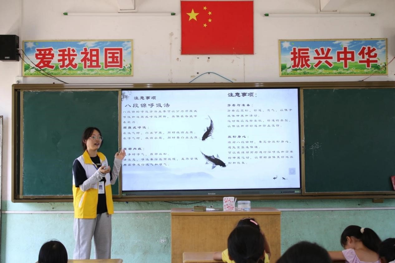 圖為隊員周露怡在為小朋友講解八段錦注意事項 中國青年通訊員 邱穎瑤 攝