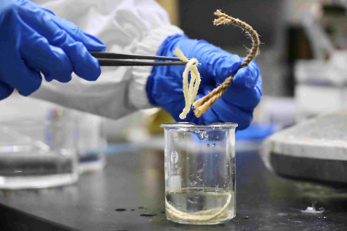 實踐團成員通過化學處理研發出具有透光性的苧麻原材料。張艷冰/攝