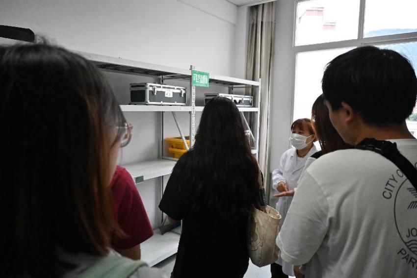 圖為鶴峰縣環境監測站技術人員覃子怡為社會實踐團成員講解檢測儀器
