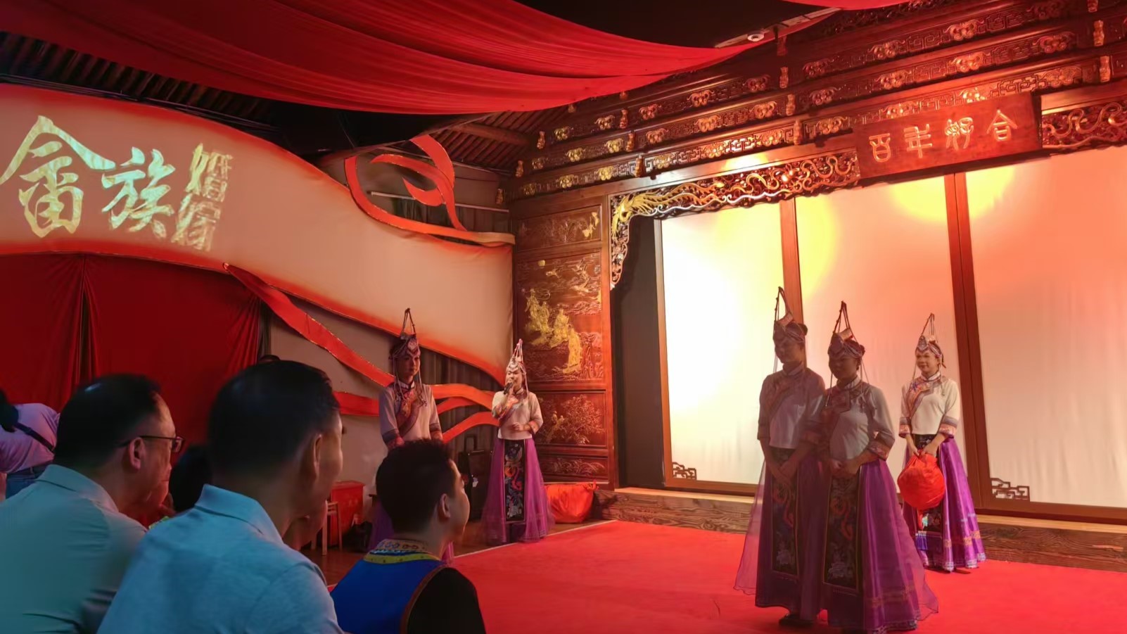 27日上午,“民聚前行隊”一同來到畬鄉之窗,觀看畬族婚嫁表演,體驗畬族服飾。最能體現畬族文化的便是婚嫁和喪事了。畬族婚嫁表演,是國家級非物質文化遺產,以一個個別出心裁的環節,用獨具特色的婚俗互動表演,展示了畬族的傳統婚嫁習俗,讓小隊成員體會一次別樣的民族婚嫁風情。