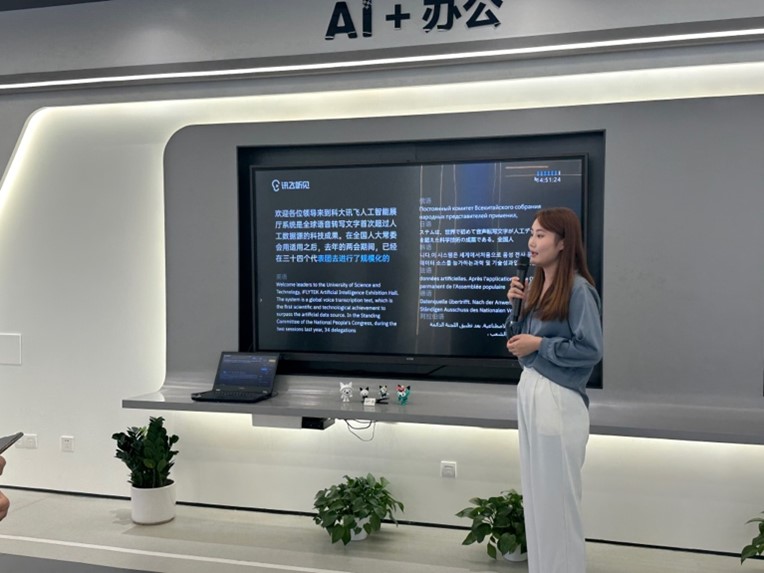 在AI+辦公展廳,工作人員介紹了訊飛聽見智慧屏、訊飛聽見智能會議系統、訊飛聽見同傳、訊飛智能辦公本等應用產品。調研隊員深刻認識到AI技術正重塑職場人的辦公方式,AI+辦公趨向勢不可擋。