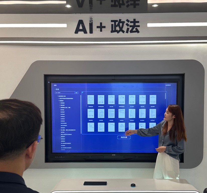 在介紹AI+政法展廳時,工作人員結合自身的工作經驗,向調研隊員展示科大訊飛AI技術如何在多元解紛、智慧法庭、輔助辦案、政法協同等多種業務場景下為法治工作者賦能提效,用新質生產力助推公平正義的實現。