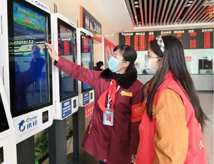 圖為春運負責人指導團隊成員操作智能購票機時拍攝的圖片。