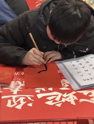 春聯作為中國傳統文化的重要組成部分,承載著人們對新年的美好愿景。本次活動,少年一代通過書法書寫春聯,為社區居民送上真摯的祝福。活動現場,紅紙翻飛,墨香四溢,孩子們在書法老師的指導下,認真揮毫潑墨,一筆一畫地寫下寓意美好的對聯和“福”字。