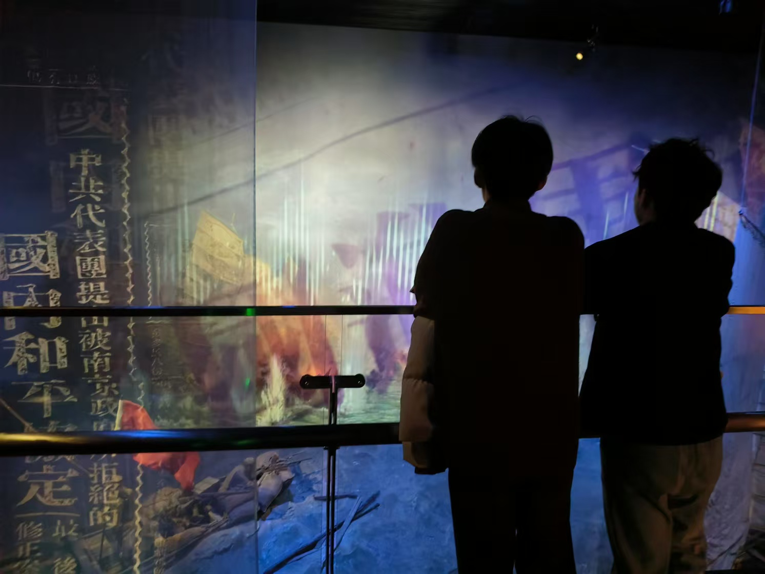 小隊成員在渡江勝利紀念館觀看影像。張妮攝