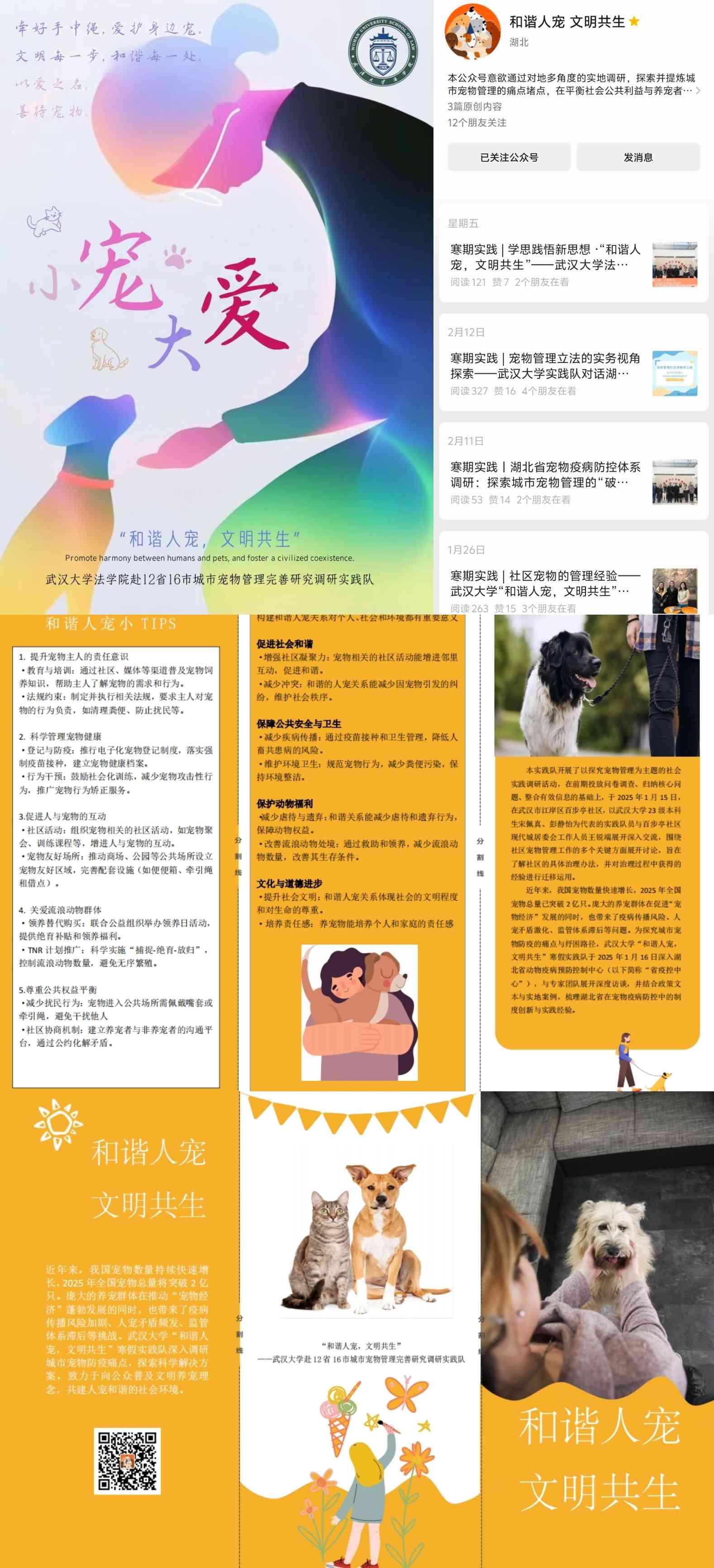實踐隊成員精心設計了宣傳科學養寵理念的海報、三折頁,并開通名為“和諧人寵 文明共生”的微信公眾號,宣傳實踐隊的寒期實踐活動。