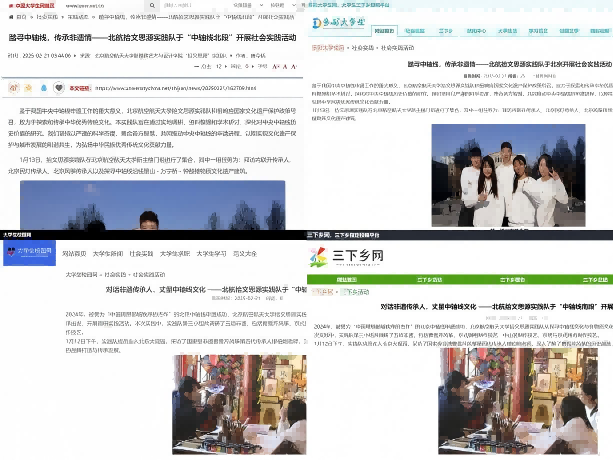 拾文思源實踐隊搭建五大宣傳矩陣。微信公眾號“拾文錄”推出近30余篇推送,涵蓋了非遺調研、中軸探訪等內容,全方位、多層次展示拾文思源調研成果;小紅書“拾文錄”同步非遺項目介紹,推出30余篇筆記,同時緊跟蛇年春晚與國際友人入駐熱潮,多模塊、多主題傳播中華優秀傳統文化;嗶哩嗶哩、抖音“拾文思源實踐隊”以vlog展示實踐隊青春風采,以采訪視頻傳播非遺文化,以微型紀錄片介紹中軸線建筑,發布共近30條視頻;實踐隊成果全方面更新在拾文思源實踐隊官網。