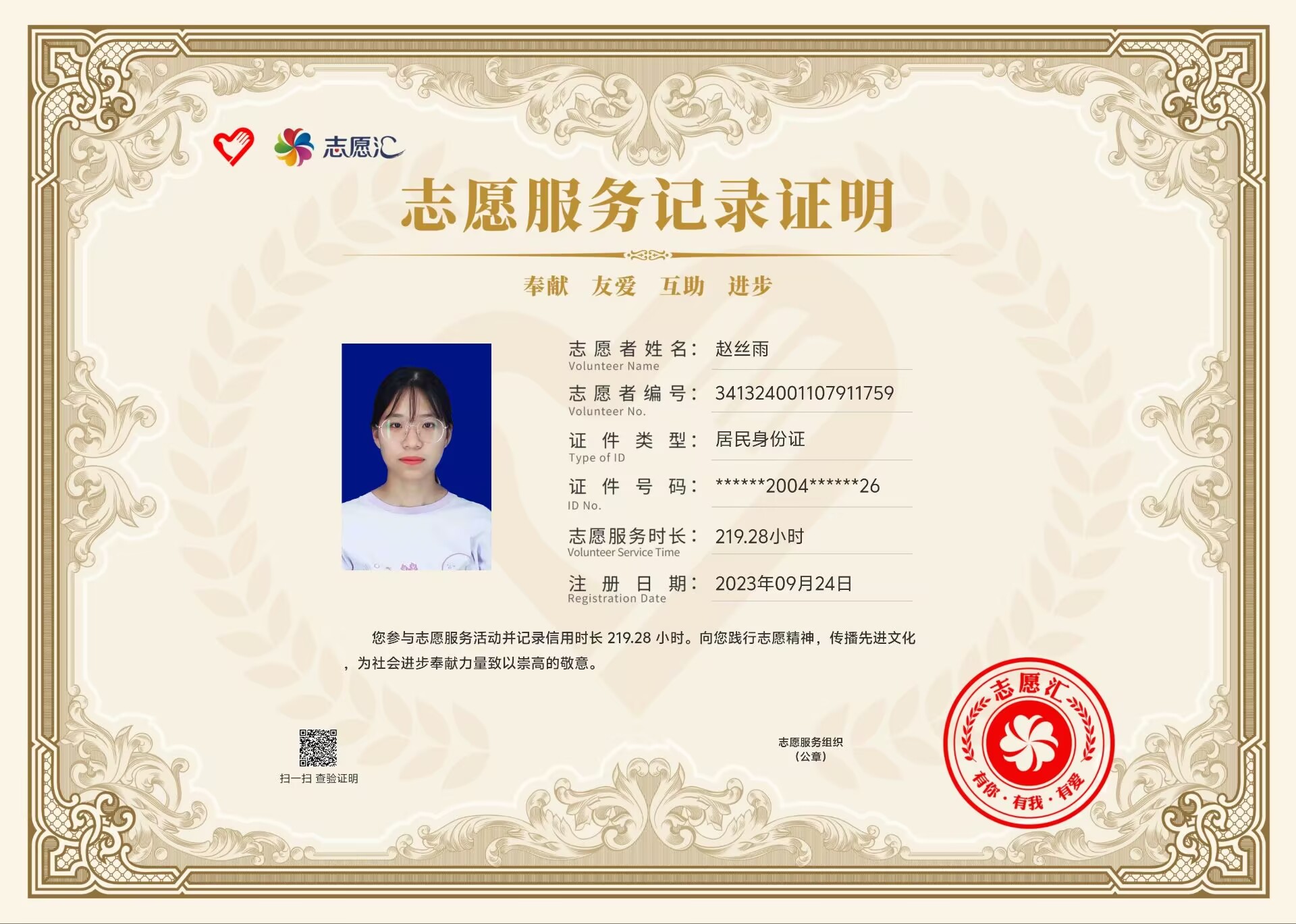 本草送康,躬身社區——趙絲雨志愿服務維護社會利益事跡 趙絲雨,安徽中醫藥大學第一臨床醫學院中醫學2023級本科生,漢族,團員。積極參加中醫藥文化進校園等活動,致力于中醫藥文化宣傳。積極投身志愿服務,多次參加義診,并于2025年暑假參加三下鄉活動,擔任“本草傳馨,導引送康”服務隊的隊長。志愿時長累計超過219小時;現任安徽中醫藥大學中藥資源中心講解團講解員;現擔任大學生傳統養生保健協會部長。在2023至2024學年獲得校二等獎學金。 在服務社會、守護民眾健康方面,趙絲雨同學展現了突出的行動力、領導力與奉獻精神。作為“本草傳馨,導引送康”三下鄉服務隊隊長,她深刻認識到中醫藥學子服務基層、回饋社會的責任。她以身作則,帶領團隊深入社區,將課堂所學轉化為服務民眾的實際行動。在社區服務點,趙絲雨同學發揮專業所長,熱情細致地為居民提供推拿服務,緩解他們的筋骨疲勞;耐心講解常用中藥的功效與應用,普及中醫藥養生保健知識;運用所學技能,認真為居民測量血壓、血糖,進行基礎健康監測,并給予相應的健康生活建議。她的行動并非一時興起,而是長期堅持參與、在多個項目中活躍,將服務社區、守護健康內化為自覺行動。