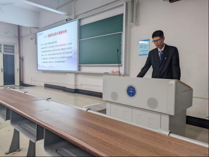 宣講人賈振文以“國家安全,青春挺膺”為主題,以2014年4月15日習近平總書記在中央國家安全委員會第一次全體會議上的講話,闡釋了總體國家安全觀的內涵。同時,賈振文同學還為與會人員分享了有關國家安全的警示案例,讓我們認識到國家安全,人人有責。在第十個全民國家安全教育日這個特殊時刻,,我們要牢記使命,挺膺擔當,以實際行動踐行總體國家安全觀,為維護國家安全貢獻自己的青春力量。