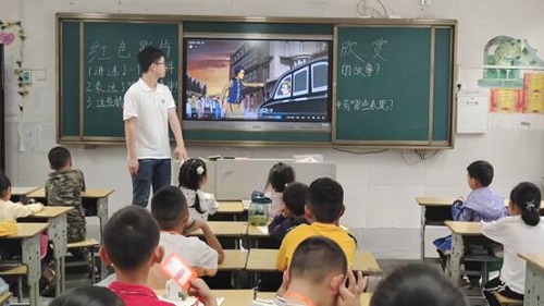 圖為團隊成員帶領學生觀看《為中華之崛起而讀書》,體味紅色精神。