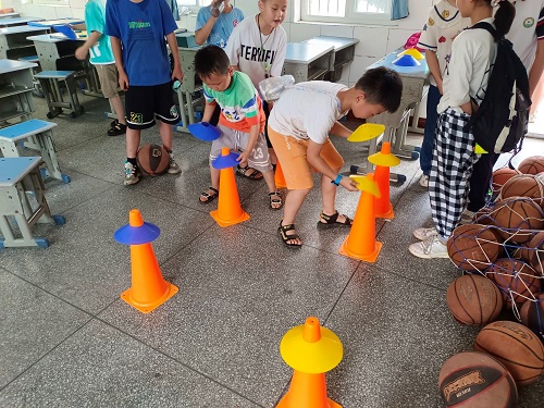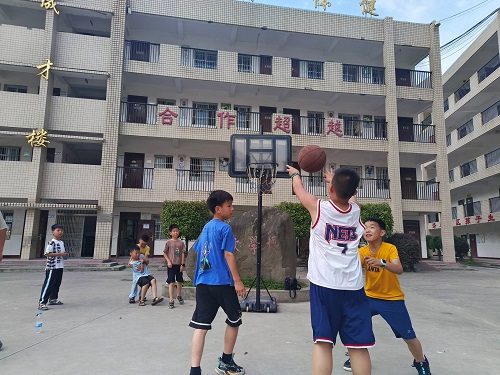 圖為體育課上孩子們在籃球場上揮灑汗水,發揚勇敢拼搏的精神。