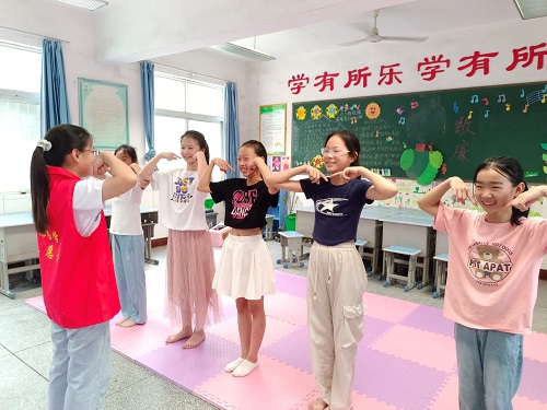 圖為舞蹈課上,志愿者服務隊成員與孩子們跳舞互動。
