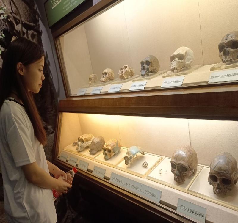 實踐隊員繼續(xù)向展廳深處走,看見了擺放的頭骨。屬于直立人階段的有鄖縣人、鄖縣梅鋪人、鄖西白龍洞人;屬于早期智人階段的有鄖西黃龍洞人。