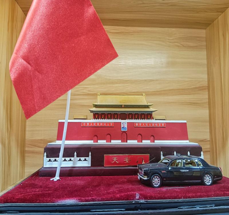 杜老先生又帶領實踐隊員來到4輛車模前說道:“這個車是鄧小平檢閱車,這是江澤民檢閱車,胡錦濤檢閱車,習近平的檢閱車。這個在收藏界稱之為“四大檢閱”。但是呢,只有江澤民這個車作的很小1比43。沒辦法,你出去把那車都拿出來看不見,我這弄了個天安門作了個底座,我把這個中和了一下。檢閱不也在天安門檢閱嘛,正好把這個檢閱車放在天安門,要是沒有天安門太小。”