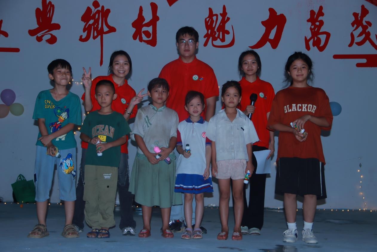七點半,晚會正式開始,一首《日不落》點燃全場氣氛。隨后,由村民組成的歌舞團為觀眾帶來瑤族舞蹈《過山搖》,他們的表演給觀眾帶來了無盡的歡笑。晚會還為穿插了一些互動環節,比如搶凳子等,讓村民人人參與活動,增強了晚會的互動性和參與感。歡聲笑語在空中回響,晚會逐漸進入尾聲,由全體村干、駐村工作隊隊員及“筑鄉共凈”服務團全體成員共同演唱的歌曲《我和我的祖國》結束了這一場晚會,晚會充滿了村民對萬茂村的熱愛和期待。