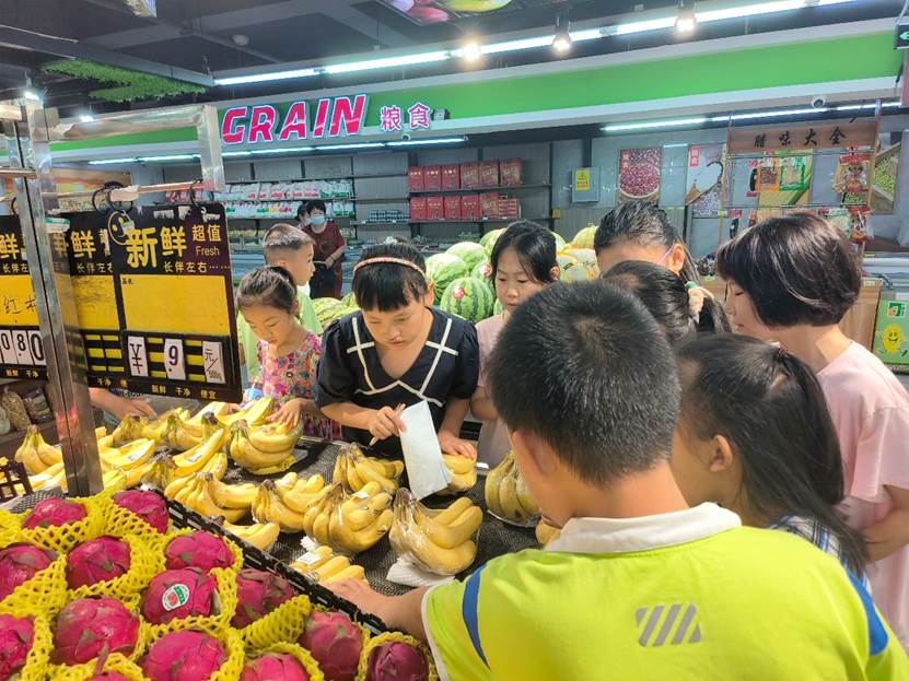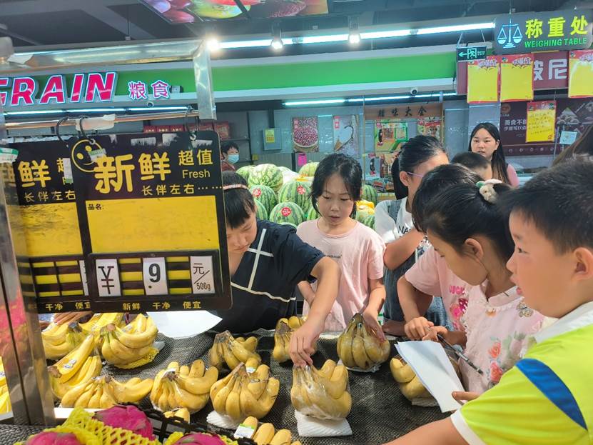 本次市場調研活動,由北江路三名志愿者老師帶領18名同學開展,三名老師帶隊分別來到附近的市場,包括金豆豆超市、官廳市場等,發布了三項調研題目,分別:20元能買多少斤豬肉?一家四口要吃一頓韭菜豬肉的餃子最低消費是多少?今天所有參加活動的同學每人一根香蕉需要多少元?接收到問題后,小朋友們紛紛展開調研。