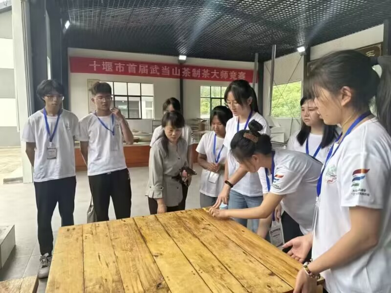 04圖為圣水茶場(chǎng)負(fù)責(zé)人向團(tuán)隊(duì)介紹制茶工序。湖北汽車工業(yè)學(xué)院提供