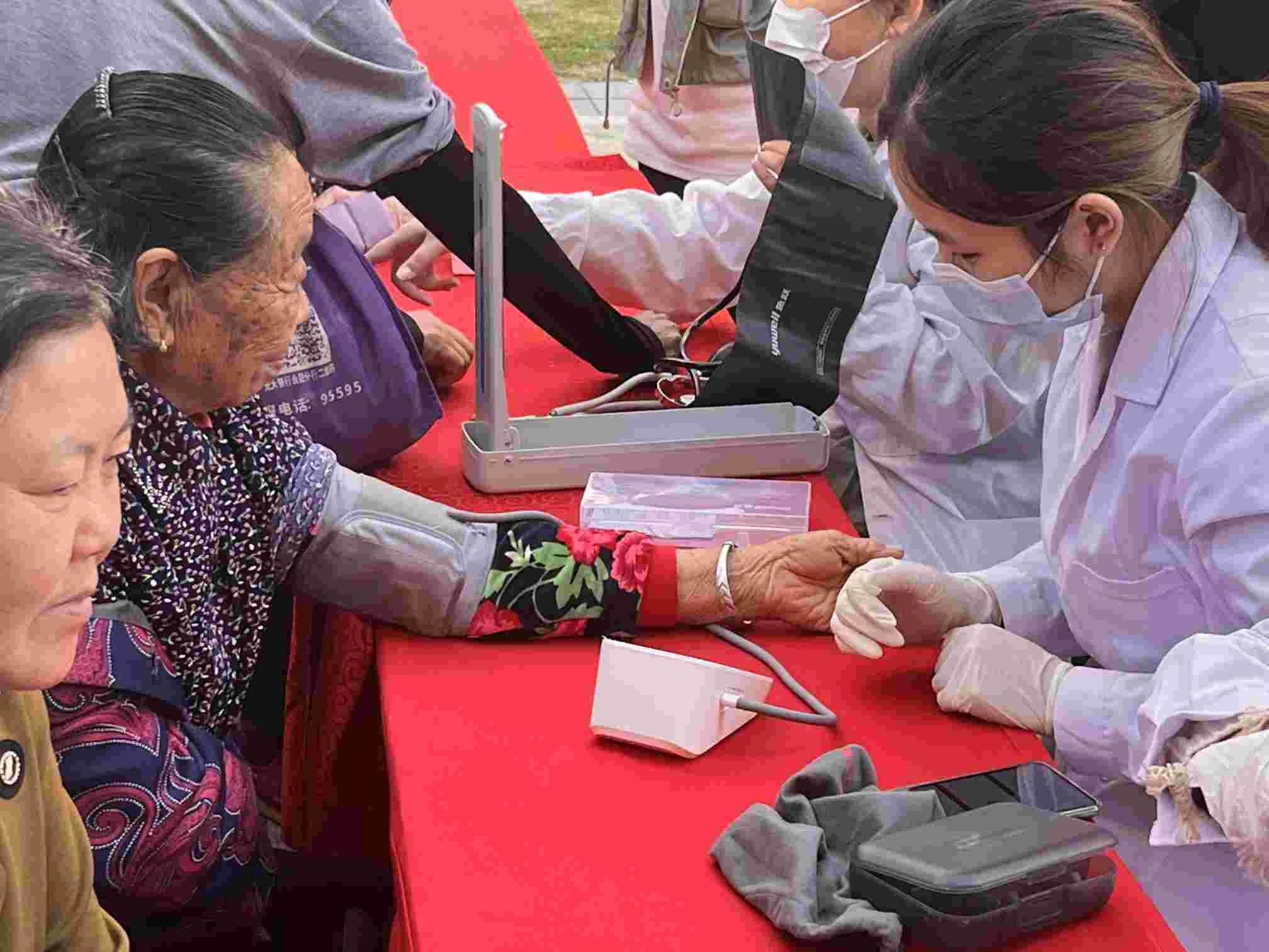 即使表演結束,咱們志愿者也沒有閑著,而是立即開展我們團隊的優勢所在:社區義診,測血糖和測血壓的場所也立即被老年人所充滿,我們在乎老年人的身體狀況,也讓他們了解自己的身體狀態,從血糖血壓的測試結果我們可以看出大部分老年人身體健康,極少數部分人有高血壓或高血糖。