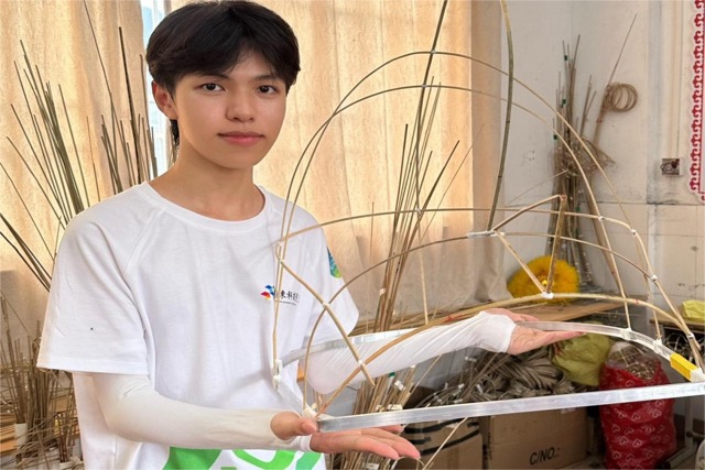圖為突擊隊隊員鄭永浩學習醒獅扎作的成果展 龔洋凌攝
