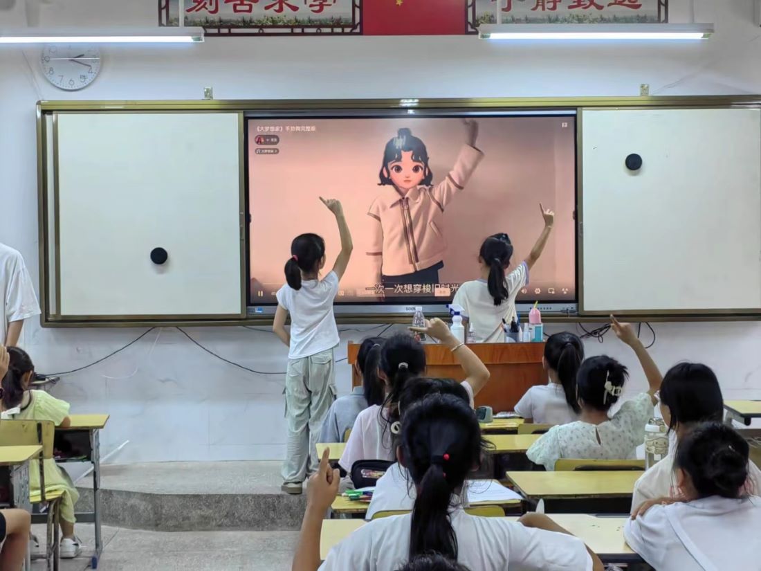 圖為全體師生對應(yīng)《大夢想家》歌曲中歌詞“插上竹蜻蜓張開了翅膀”的分解動作演示 吳肖婭 攝