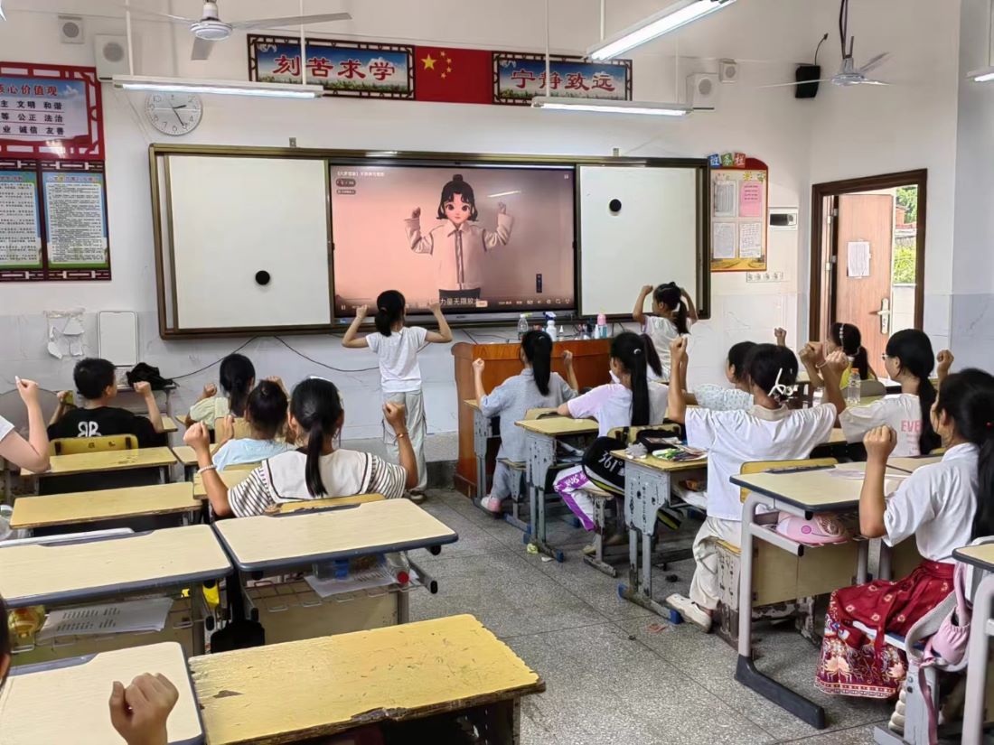 圖為全體師生一起對照視頻分解教學(xué)學(xué)習(xí)手語操 吳肖婭 攝