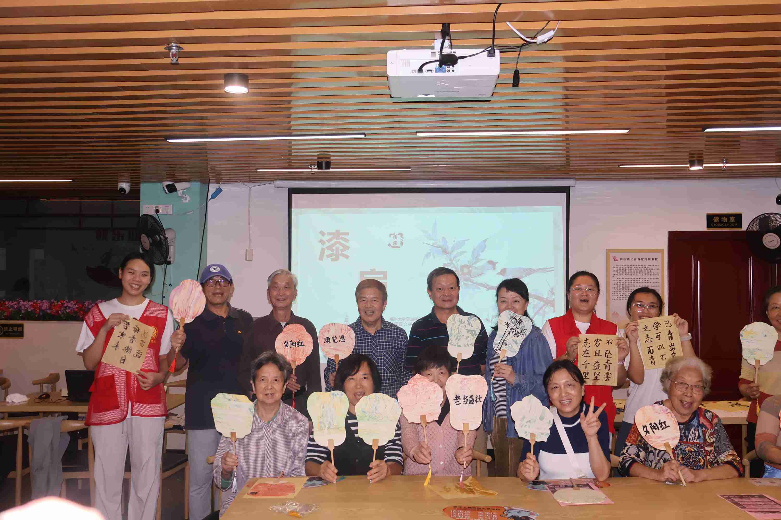 筆墨傳情,共慶華誕待扇面晾干后,大家用毛筆書寫對祖國的熱愛與祝福。學生志愿者幫助長者們在扇面上寫下祝語裝點扇面,更有擅于書畫的長者,題詩作畫為活動添彩。完成后,長者們手持漆扇,臉上洋溢著喜悅與自豪的笑容,每個人都對自己獨一無二的作品愛不釋手,大家相互分享、相互稱贊、相互傳授經(jīng)驗,現(xiàn)場一片歡聲笑語、其樂融融。