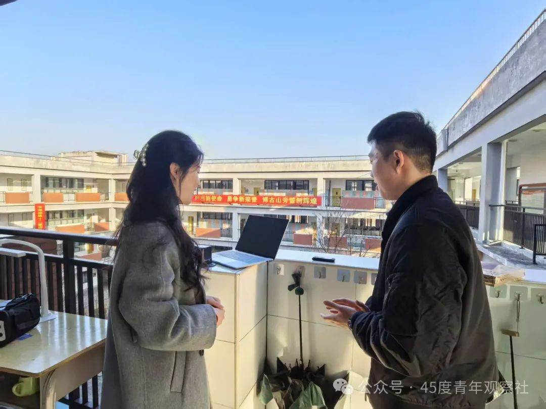 在內蒙古自治區鄂爾多斯市準格爾旗,實踐隊隊員閆枳録與民族中學的青年教師閆老師展開了交流。閆老師認為“45°青年”內心糾結,在學校常見。他從教育工作者角度出發,分析了學生群體中的“45°青年”現象,探討了其形成原因、影響及應對策略,強調學校、政府和社會組織應在青年發展中發揮積極作用。