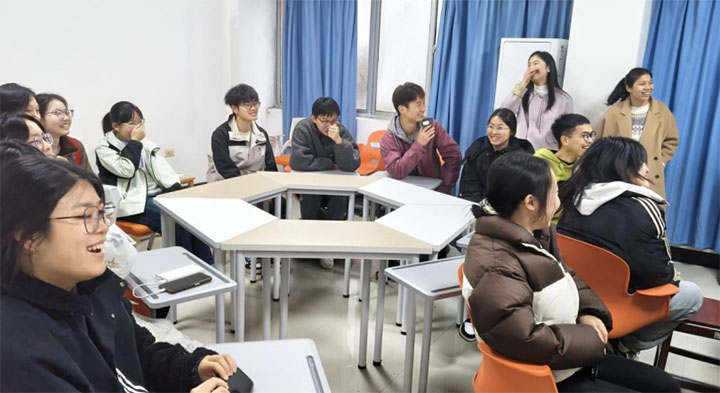 最后,壓力釋放小游戲和才藝表演環節將歡樂氛圍拉滿。在教室內,師生圍坐玩看圖說詞游戲,大家在游戲中忘卻壓力,盡情享受輕松時刻。同學們還紛紛展示才藝,歌聲、笑聲不斷。