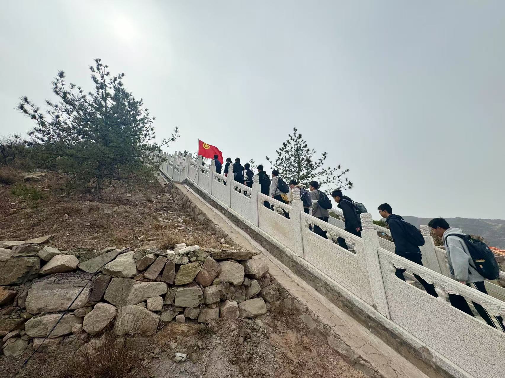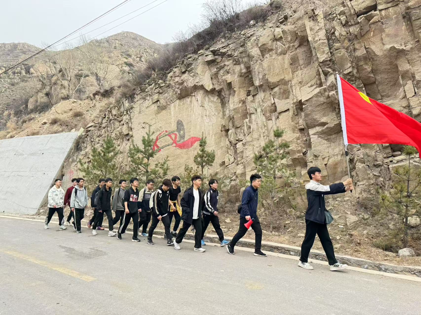 清晨7點,師生們整裝出發,背包里裝著簡單的干糧和水。一路上,嘹亮的紅色歌曲在山間回蕩,年輕的面龐上寫滿堅毅。“團結就是力量,這力量是鐵……”的激昂旋律穿透春日薄霧,伴隨著整齊的步伐,成為春日山野間最動人的風景。歷經5小時跋涉,當隊伍抵達烈士陵園時,學生們雖已疲憊不堪,卻依然挺直脊梁。2022級學生祝嘉璞堅定地說:“36公里確實不輕松,但比起先烈們走過的路,這又算得了什么?”