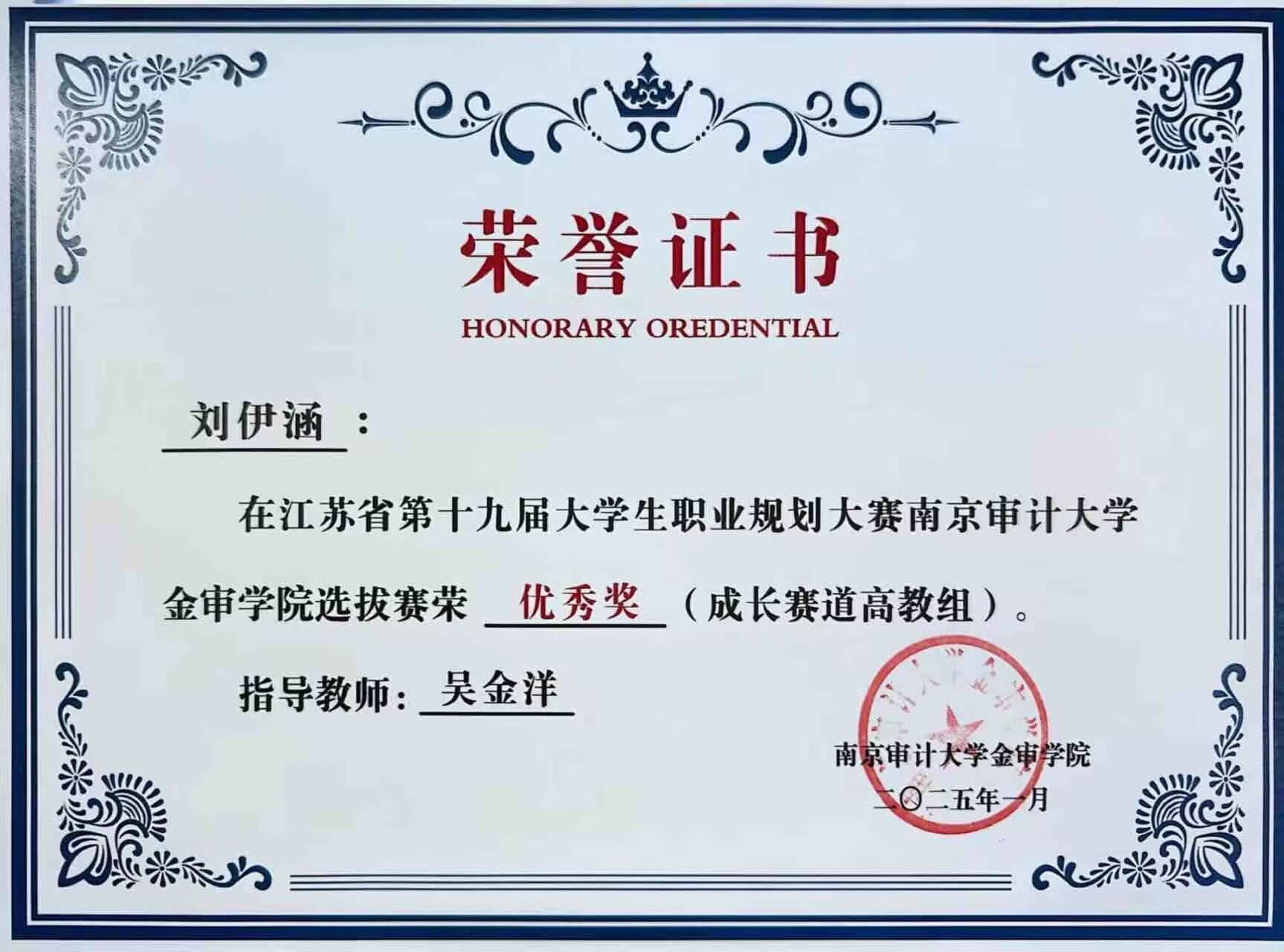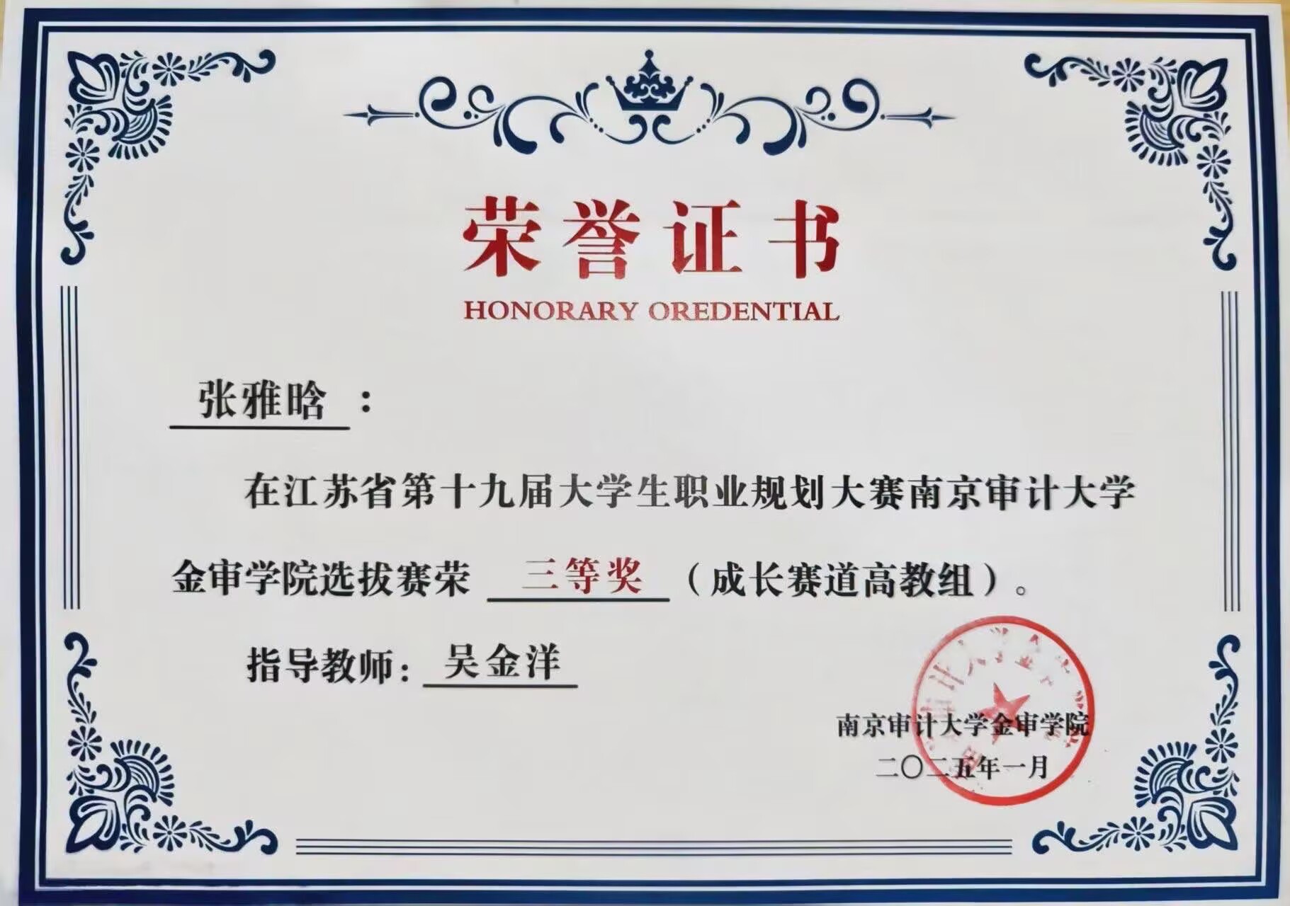 近日,南京審計大學(xué)金審學(xué)院金融與經(jīng)濟學(xué)院成功舉辦了職業(yè)規(guī)劃大賽校內(nèi)選拔賽,經(jīng)過激烈角逐,一批優(yōu)秀學(xué)生脫穎而出,展現(xiàn)了學(xué)院學(xué)子卓越的職業(yè)規(guī)劃能力和綜合素質(zhì),為學(xué)校和學(xué)院贏得了榮譽。期中24級金融實驗班張雅晗獲得成長賽道三等獎,24級金融2班劉伊涵、24級金融3班左繹彬獲得成長賽道優(yōu)秀獎。