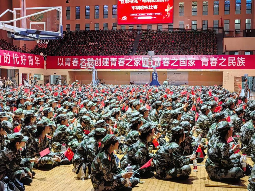 比賽在莊重的氛圍中拉開序幕。各營隊身著統一軍訓服,精神抖擻地依次登場。為增強藝術感染力,同學們在演唱中巧妙融入多元創意,學子們歌聲嘹亮、情感真摯,每一句演唱都飽含對家國的赤誠熱愛,不時引發全場共鳴,掌聲與合唱聲交織回蕩!陡璩鎳贰段覑勰阒袊返冉浀浼t歌接連響徹場館,學子們用嘹亮的歌聲回溯崢嶸歲月,以真摯的情感致敬英雄先輩。